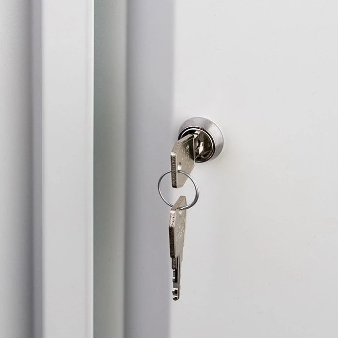 - На дверь каждой секции установлен ключевой замок «Практик». Когда замок заперт, дверь удерживают в закрытом состоянии магнитные защёлки.