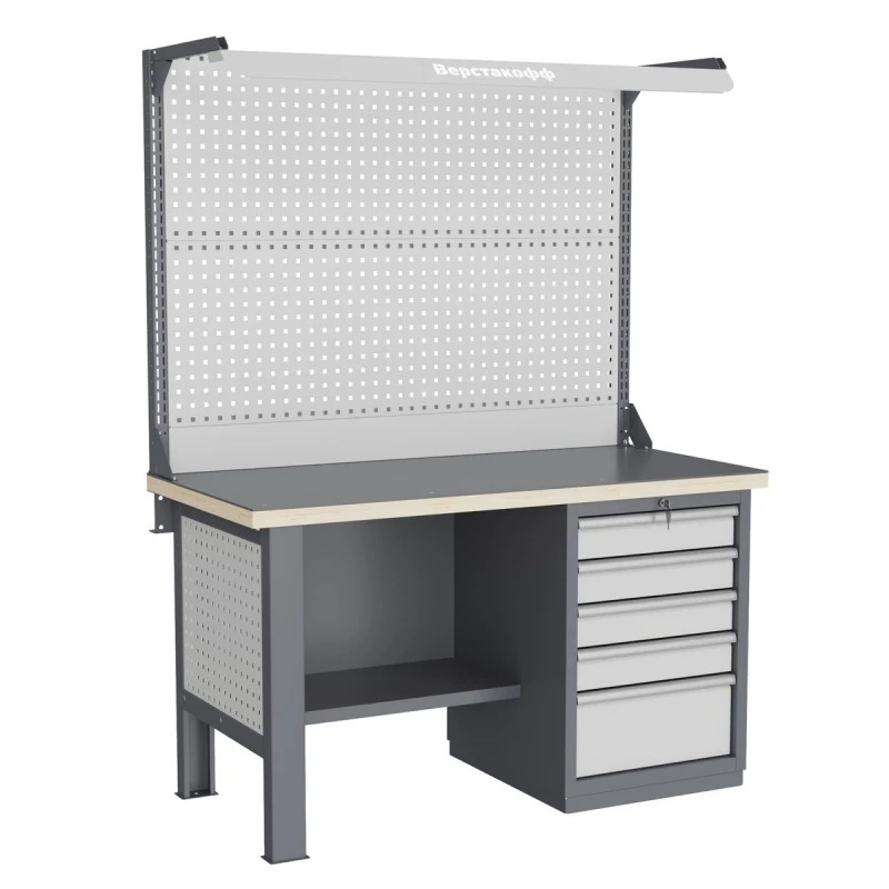 - Рабочее место комплектуется двойным перфорированным экраном, на котором удобно размещать держатели для инструментов, полки и другие навесные элементы, благодаря чему весь необходимый инвентарь всегда будет на виду.